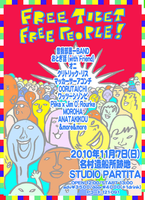 管理人様 曽我部恵一BAND出演のイベントを お知らせさせていただきます。 不適切でしたら削除お願いします。 ■2010年11月7日(日) ■大阪名村造船所跡地 STUDIO PARTITA ■OPEN12:00 START13:00 ■前売3500円 当日4000円 1ドリンク500円 出演アーティスト 曽我部恵一BAND おとぎ話(With Frend) OORUTAICHI Qomolangma Tomato Piika × Jim O'Rourke オニ ANATAKIKOU マッカーサアコンチ MOROHA クリトリックリス ワッツーシゾンビ &more!!! イベ
