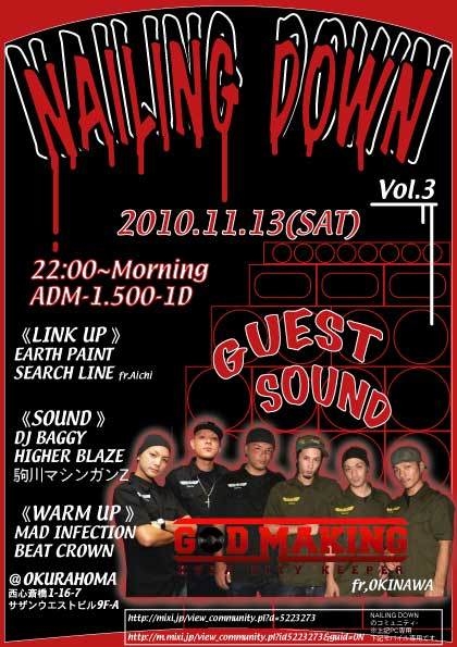 毎月第二土曜日 大阪・ミナミで開催中!!! 【NAILING DOWN】 @オクラホマ 毎月、県外からの GuestSoundを迎えて 大阪の新定番dance!!! 今まで見れなかった あのSound 最近注目の あのSoundが来阪☆ 11月は、 南は沖縄から 【GOD MAKING】 を迎えて開催決定!!! 気になる人も多いはず! 最注目Sound! お見逃し無く☆ 詳細 ↓↓↓ 【NAILING DOWN vol.3】 2010.11.13(sat) @オクラホマ open→22:00〜morning ADM→\1500-1D 【GUEST SOUD】 GOD MAKING from 沖縄 http://mixi.jp/view_c