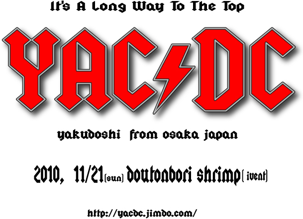 告知掲載失礼します 大阪で活動中の「YAC/DC」(ヤクドシ)といいます そんなこんなで 我らがヤクドシもライブがあと2週間後に迫りました(笑) 世間の皆さまのお力が必要です。 2010 11/21(日) 道頓堀SHRIMP 〒542-0086大阪市中央区西心斎橋2-4-7 B1. TEL&FAX:06-6214-0533 OPEN:18:30 START:19:00 前売¥1800(D別) 当日¥2300(D別) 【CAST】 JB.MARK store DOLPHIN KICK Jug a billy cats YAC/DC esse DJ’HIRO 2番目の出番(のハズ) チケット取り置きしま