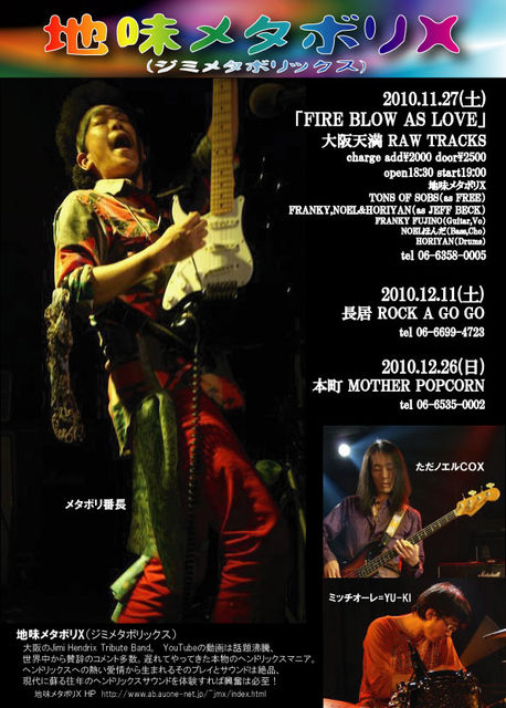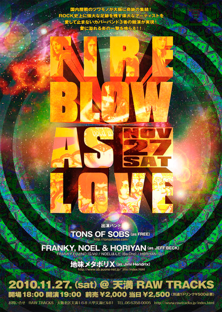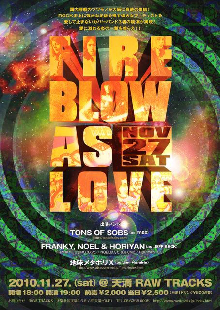 国内歴戦のツワモノが大阪に奇跡の集結! ROCK史上に強大な足跡を残す偉大なアーティストを 愛して止まないカバーバンド3者の競演が実現! 愛に溢れる炎の一撃を喰らえ!! 2010.11.27(土) 「FIRE BLOW AS LOVE」 大阪天満 RAW TRACKS tel 06-6358-0005 http://mixi.jp/view_community.pl?id=5197217 charge add\2000 door\2500 open18:30 start19:00 <出演> ☆TONS OF SOBS(as FREE) http://tonsofsobs.com/ ☆FRANKY,NOEL&HORIYAN(as JEFF BECK) FRANKY FUJINO(Guitar,Vo) http
