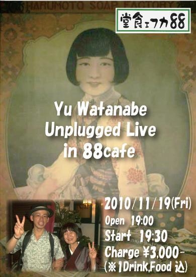 【開催概要】 開催日 2010年11月19日(金) 時 間 Open 19:00 // Start 19:30 場 所 88カフェ食堂 (東大阪市吉松2丁目1番9号 TEL:06-6722-8581) ※近鉄大阪線「長瀬駅」下車。駅から徒歩40秒 チャージ (前売・当日共に)\3,000- 【ライブ・1ドリンク・フード込】 定員 17名 (※要予約♪) ポイント! 88カフェ食堂のコミュニティにご参加の上で、ライブに 参加頂けると「1ドリンク」から「2ドリンク」へUp!! ※その際、コミュニテ