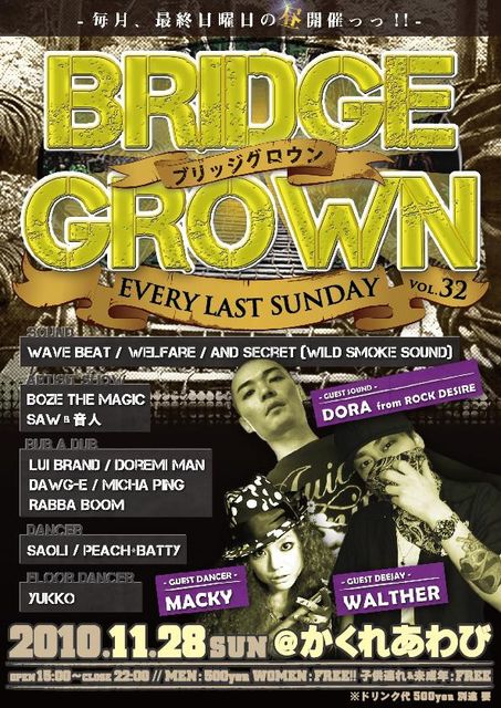 管理人様、失礼します。 レゲエを知ってる人も、初心者の方も!! オールできない高校生やパパママも!! 自分のペースで聴く・踊る・ガンフィンガー・POW POWと声をあげる・更にもっと踊る♪♪ OLDESからBRAND NEWまでいろんな曲が流れます♪ 昼からアメリカ村で、そんなダンスがあるんです!!!! 『毎月最終日曜日』 『BRIDGE GROWN』 @かくれあわび(なんば) 11月28日(SUN) 昼15:00〜22:00 無料テキーラタイムあり!! 20歳未満、お酒飲めない方はチュッパチャップス!! 先着限定CDプレゼント!! 屋内のため雨で