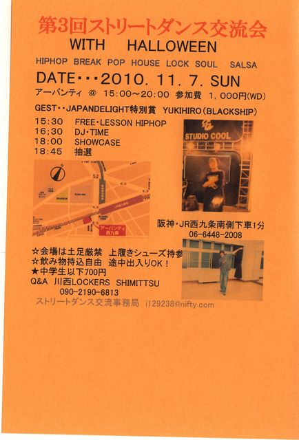 ◆ストリートダンス交流PARTY Vol.3☆ ◎日時 2010.11.7(SUN) 15:00〜20:00 ◎参加費 1,000円(ドリンク付) ◎場所 アーバンティ西九条(JR西九条駅南出口スグ) 06−6448−2008 土足厳禁 シューズをご用意ください☆ 飲食物持込OK!! 途中出入りOK!! 15:30〜HIPHOP無料レッスン YUKIHIROさん(BLACK SHIP) 18:00〜SHOW CASE☆(当日受付OK!) 7組まで予定していますが最大10組まで可! 18:45〜抽選会 ◎レッスンありDJタイムありショーケースあり