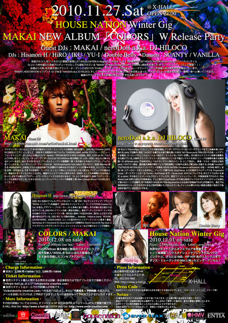 待望されつつ、約7ヶ月ぶりに開催が実現した『 HOUSE NATION in Nagoya 』!今回は12月1日に発売される『 HOUSE NATION Winter Gig 』のリリースパーティと、DJという枠を越えた音楽プロデューサーとしても認知されている”MAKAI”のNew Concept Album 『 COLORS 』発売を記念したWリリースパーティーとして開催!!!会場はこの秋、名古屋大須にグランド・オープンしたばかりの“X-HALL”。ダイナミックで迫力あるニューサウンドシステムを装備し非日常的空間を演出いたします。“MAKAI”、HOUS NATIONレジデントDJである”neroDoll a.k.a. DJ HILOCO