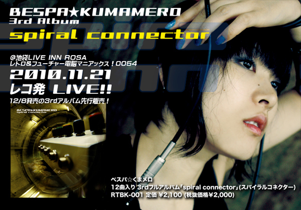 12/8に発売のべスパ☆くまメロ3rdフルアルバム「spiral connector」の先行販売ですよ! ぜひぜひ、いち早くゲットしてね☆ 今回なんと、あの「テクノ外交官」ことTobyさんがRemixで参加して下さいました!! オンラインショップでのご購入→http://dlonline.ocnk.net/ -------------------------------------------------------- 2010年11月21日(日) べスパ☆くまメロ3rdアルバム「spiral connector」レコ発ライブ! 池袋LIVE INN ROSA 「レトロ&フューチャー 電脳マニアックス!0054」 http://www.artism.jp/ae_lf54.html Open&Start