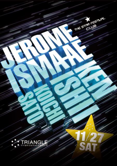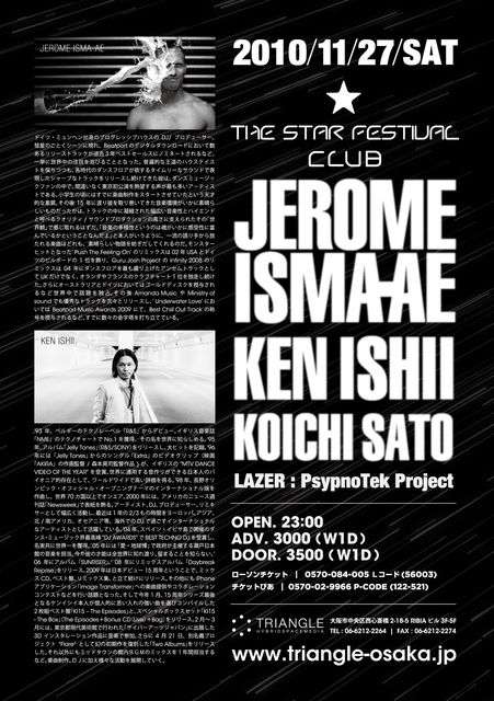 11/27.SAT、大阪TRIANGLEにて、今や世界的スーパースターのプログレッシブハウスDJ/プロデューサー"JEROME ISMA-AE"、更に東洋のテクノ・ゴッド"KEN ISHII"の共演が決定!!THE STAR FESTIVAL-CLUB-ならではの豪華なコラボレーションを見逃すな!!