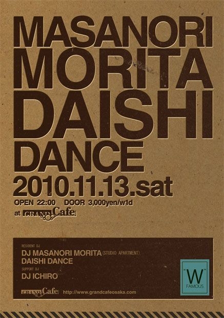 グランリニューアル後初のDAISHIさんのイベントでするんるん TIME: 22:00 ~ LATE PRICE: 3,000YEN/W1D GENRE: House ARTISTS: ■DJ■  MASANORI MORITA(STUDIO APARTMENT)  DAISHI DANCE  ICHIRO 携帯電話携帯でイベントのページを見せたら\1,000 OFFになりますわーい(嬉しい顔)