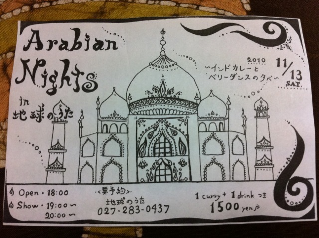 △▼△ Arabian Night △▼△ 〜インドカレーとベリーダンスの夕べ〜     in 地球のうた   2010・11・13 sat. *。カレーの妖精(妖怪?)森くんのインドカレーと ベリーダンスのコラボレーション☆★ インドカレーとチャイにほっこり。。 魅惑のベリーダンスにうっとり。。。 ホッコリーナ・ウットリーナな夜は 是非 地球のうたで。。。♪ * open 18:00 * show 19:00〜  20:00〜 1curry+1drink   \1500也 要予約:地球のうたへ。