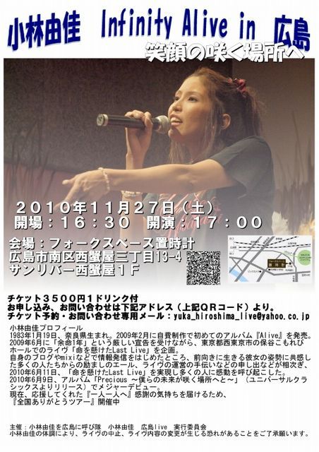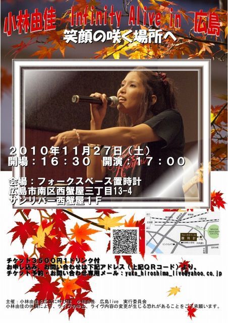 広島ライヴの告知をさせていただきます。 2010年11月27日(土) 開場:16:30 開演:17:00 会場:フォークスペース置時計 広島市南区西蟹屋三丁目13-4 サンリバー西蟹屋1F 費用:チケット3500円1ドリンク付 備考: チケット予約は10月初旬よりメール受付にて開始予定です。 会場キャパシティは40人です。定員に達し次第締め切りといたします。 このトピックの参加ボタンでは予約できませんのでご注意ください。 ご質問等ありましたらこちらのトピッ