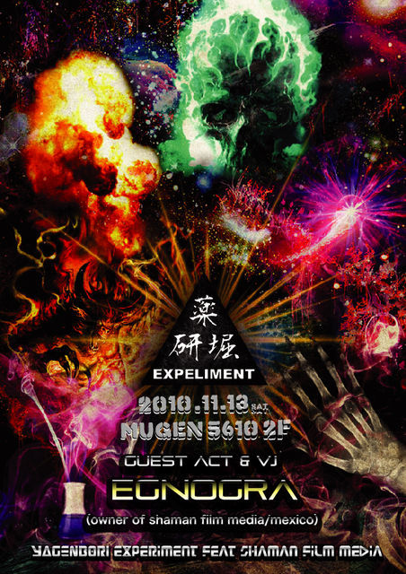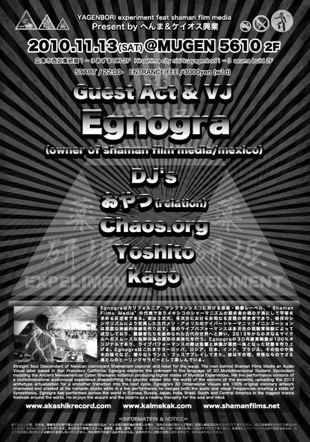 YAGENBORI EXPERIMENT feat shaman film media @mugen 5610 2F 広島市中区薬研掘1−3 あずまビル2F Hiroshima city naka-ku yagenbori1−3 azuma build 2F tel 082-240-7788 START 22:00〜 ENTRANCE FEE 3000yen(w1d) 【Guest act & VJ】 Egnogra(owner of shaman film media/mexico) 【DJ's】 おやつ(relation) Chaos.org Yoshito kago 【Guest Profile】 Egnograはカリフォルニア、サンフランシスコに於ける音楽・映像レーベル、”Shaman Film Media”の代表でありメキシコのシャーマニズ