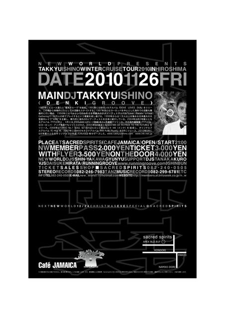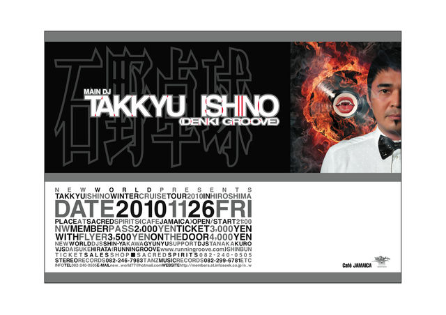 6年振りとなるオリジナルソロ作品『CRUISE』をリリースし、 ますます目が離せない石野卓球のDJツアー 『TAKKYU ISHINO WINTER CRUISE TOUR 2010』広島公演が決定! 時代に媚びない、正統派ダンス・ビートを体感せよ!!! http://www.sonymusic.co.jp/Music/Info/kioon/artist/news/?artist=72000037 http://ro69.jp/news/detail/41196 チケットのお問い合わせ、取り置き等お気軽にメッセージ下さい。 当日は石野卓球オフィシャルグッズのTシャツを数量限定で 販売いたします。 NEW WORLD presents TAKKYU ISHINO WINTER CRUISE