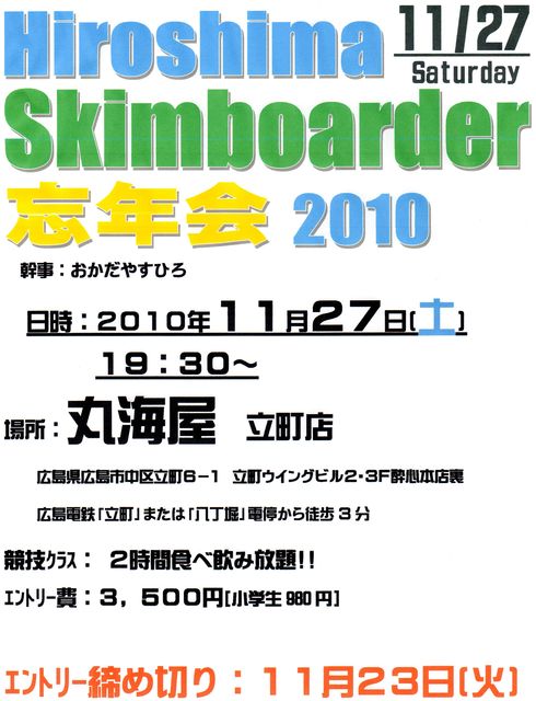 詳細決定しました! 11月27日(土) 19:30〜 丸海屋 立町店 広島県広島市中区立町6−1 立町ウイングビル2・3F酔心本店裏 広島電鉄「立町」または「八丁堀」電停から徒歩3分 会費3500円(こども980円) ☆2時間食べ飲み放題☆ 23日(火)までに参加・不参加の連絡ください! レスしてもmixiメールでも、携帯でもOKです☆ 今年デビューの人も、いつもの人も、 これから始めてみたい人も、 みんなでワイワイ飲んで騒いでウダウダ言いましょう 遠慮はいりませんドシ