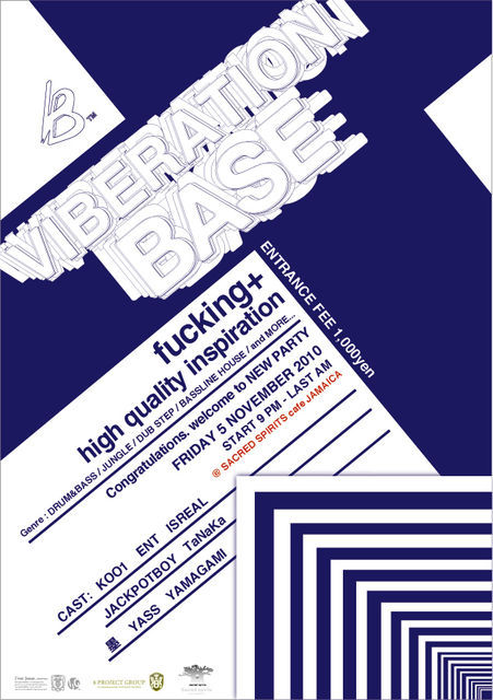 【VIBERATION BASE】 vol.5 2010.11.05(FRI) @sacred spirits cafe JAMAICA 広島市中区立町6-3 APEX.BLD B1F ADV:1000yen DOOR:2000yen ●cast KOO1/ENT (Viberation Base) JACKPOTBOY (JACKPOT / BASSLINE JUNKESE) ISREAL (Vital Yawd,Rude) TaNaKa (Sacred spirits Cafe JAMAICA) 墨/YASS (DEAD STOCK) YAMAGAMI ------------------------------------ 広島からDRUM&BASSを軸にUK HEADZ MUSICを発信する"VIBERATION BASE"。 前回のvol.4は総勢9名のDJでBPM60-180を演出し、クラウドを完全にロックした異