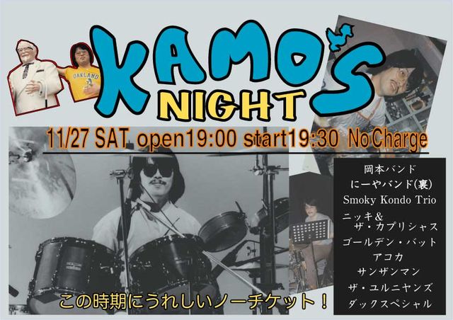 元祖オーナー祝誕生祭 【KAMO'S NIGHT】 いろんなバンンドが駆けつけてくれます! ありがたいですなぁ open19:00からで、 19:30〜20:00 岡本バンド 20:00〜20:30 にーやバンド(裏) 21:00〜21:30 Smoky Kondo Trio 21:30〜22:00 ニッキ&ザ・カプリシャス 22:00〜22:30 ゴールデン・バット 22:30〜23:00 アコカ 23:00〜23:30 サンザンマン 23:30〜24:00 ザ・ユルニヤンズ 24:00〜24:30 ダックスペシャル いっぱい出てくれます!なんかいい感じにコイ〜ですね チャージはありません!こ