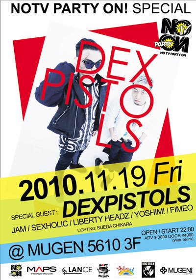 管理者様、失礼致します。 11/19(FRI) at MUGEN5610 3F NOtvPARTYon SPECIAL ”DEXPISTOLS” OPEN/START-22:00〜 Guest DJ - DEXPISTOLS Host DJ’s J.A.M / SEXHOLIC / LIBERTY HEADZ / YOSHIM! / FIMEO Entrance Fee - ADV:¥3,000 DOOR:¥4,000 (with Order) Infomation MAPS (082)241-0089 - info@maps-shop.com 店頭(MAPS)にてチケットの販売も行っております。 about DEXPISTOLS 20XX年、進化したテクノロジーにより、東京ストリートカルチャー シーンが生み出した2ピースDJバンドDEXPISTOLS