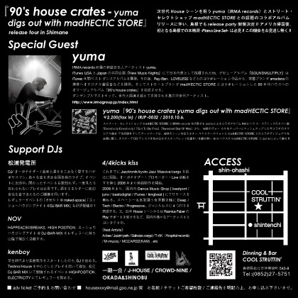 次世代Houseシーンを担うyuma(IRMA records)とストリート・セレクトショップmadHECTIC STOREとの話題のコラボアルバムリリースに伴い、リリースツアーとしては初の島根でもparty 開催決定!!