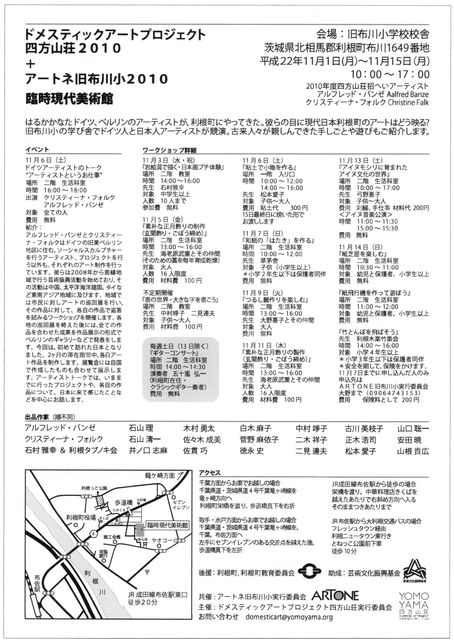 旧布川小にて、ARTONE 臨時現代美術館が、本日から11月15日まで開催されております!入場無料です!たくさんのボランティアに支えられたアートプロジェクトです。 町内出身作家、在住作家、ドイツからも、お二人の作家が参加しておりますよ! 是非、お誘い合わせの上、ご来場下さい。 楽しいワークショップ(体験教室)もたくさん開催されます。 詳細は、こちらまで http://artoneproject.web.fc2.com/