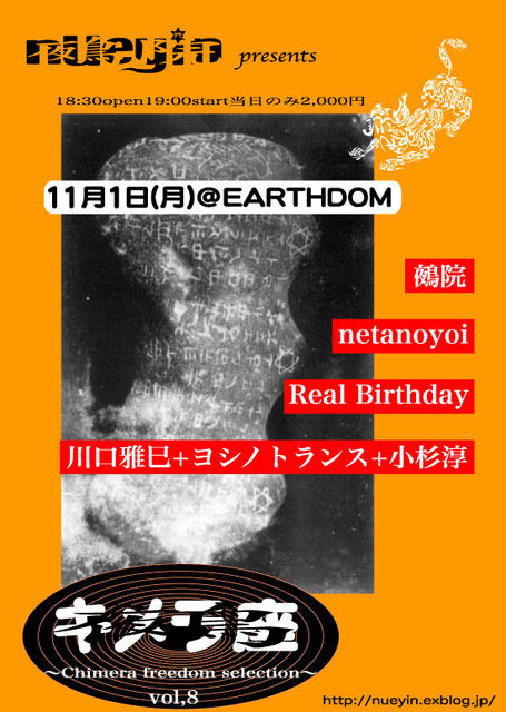 11/1(月)新大久保EARTHDOM 鵺院presents「キメラ座vol,8」 *鵺院 *ねたのよい *Real Birthday *川口雅巳+ヨシノトランス+小杉淳 OPEN 18:30/START 19:00 当日のみ \2,000 東京都新宿区大久保2-32-3 リスボンビルB1 TEL 03-3205-4469