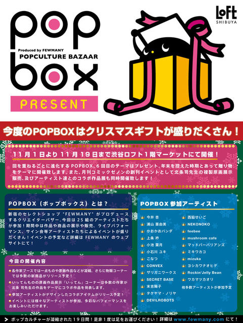 POPBOX−PRESENT− 今回のテーマはプレゼント、年末を控えた時期と合って贈り物をテーマに開催致 します。また今回は北条司デビュー30周年記念&月刊コミックゼノン創刊記念 として30名のアーティストが北条作品をテーマに作品を発表、渋谷ロフトと吉 祥寺カフェゼノンにて作品の展示販売を致します。 更に渋谷ロフトでは特設コーナーを設けて北条司先生の複製原画の展示販売も行 います。 その他にも読書の秋にちなんで参加アーティストたちによる布製ブックカバーの 24種発売やiPhone4のケースの発売など気になる商品