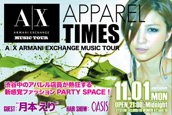 アパレル関係者必見 渋谷の人気クラブキャメロットで、アパレル業界人が集まってはじめる話題のイベント 渋谷中のアパレル店員が熱狂する新感覚ファッションPARTY SPACE 今回はARMANI EXCHANGE (アルマーニ・エクスチェンジ)とコラボ すでに某有名ショップが多数参加表明しています アパレル業界同士の横の繋がりが欲しい方 アパレル業界の彼氏彼女が欲しい方 オシャレに敏感な方 アパレルの業界を目指してる貴方 このイベントを機に人生が変わる出会
