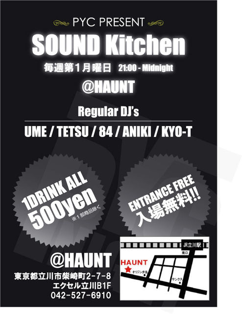 一ヶ月ぶりです UMEです 皆様、いかがお過ごしでしょうか 最近、めっきり秋めいてきましたね 個人的に抑えていた暴飲暴食が秋のせいか、また 始まりつつございます さておきまして、 11月1日(月)に4回目になるSOUND KITCHENを行います 回を追うごとにたくさんのお客様にお越し頂き感謝して おります 我々、PYC CREWはお客様にご満足いただけるよう 精一杯もり上げていきます 是非、短い時間ですが