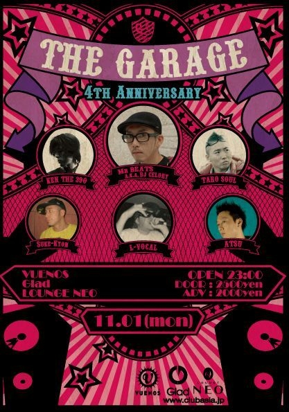 管理人様、告知失礼致します。 毎月第一月曜にBIG PARTY、 「THE GARAGE」の日が今月もやってまいりました 週始めの月曜日から人で溢れる、平日屈指の満員御礼イベント 今月はなんと…4周年のアニバーサリー RESIDENT GUEST DJのMr.BEATS a.k.a.DJ CELORYを筆頭に 各フロア豪華メンツで楽しんでいただけること間違いなしっ しかも2店舗同時開催です 是非遊びにいらして下さい メッセージを戴ければ通常は\2500/1Dのところを ゲスト料金の\1000/NO DRINKもしくは\1500/1Dにてご入場