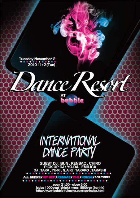 ☆☆☆DANCE RESORT☆☆☆ 〜INTERNATIONAL DANCE PARTY〜 11月2日(Tue) OPEN 21:00〜5:00 女性¥1000 1D付き 男性¥1500 1D付き 会場 BUBBLE BAR 過去に雑誌モデルや九州クラブシーンを代表するDJをGUESTに開催してきた DANCE RESORT, 今回は国やジャンルの垣根を越え、INTERNATIONAL DANCE PARTYをコンセプトに再始動!!もちろんジャンルはオールジャンル!! サポートDJもGUEST DJと変わらず第一線で活躍しているDJを選りすぐって起用!! ★SPECIAL GUEST DJs★ BUN KENSAC CHIRO