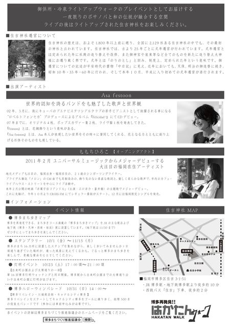 〜 住吉神社式年遷宮大祭記念 〜 住吉能楽殿『Asa festoon』ライブ ■日時 / 平成22年11月2日(火) 開場 17時45分 / 開演 18時30分 ■会場 / 住吉神社 能楽殿 http://chikuzen-sumiyoshi.or.jp/nogaku/index.html ■入場料 / 1,500円(定員 / 300名) ■出演アーティスト / Asa festoon , ももちひろこ ■チケットぴあ【Pコード:120-267】 ・チケットぴあ電話予約:0570-02-9999(24時間受付) ・店頭販売:チケットぴあ/セブンイレブン/サンクス [Asa festoon]今回は3人編成でのライブとなります。 Asa(vo