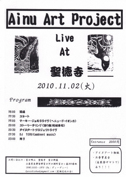 Ainu Art Project Live At 聖徳寺 16:00〜 開場 17:30〜 スタート 19:00〜 マーキー・ジョモラ  20:00〜 ストーリーテリング(語り部;結城幸司) 20:30〜 アイヌアートプロジェクト 21:30〜 Dj Teru 23:00  終了 お問い合わせ;富士峰山 聖徳寺 富士御廟 山梨県南都留群富士河口湖町富士ヶ嶺300番地 090-3332−1970(Dx;ディーディー) kuroshiobunka@gmail.com(黒潮文化の会) 尚、お泊まり希望の方はお布施程度で素泊まりする事が出来ますが、寒さが予想されますので充分な装備をしてきて下さい。 希望者はD