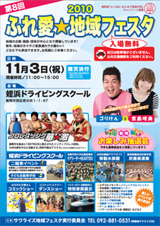 2010ふれ愛☆地域フェスタ 福岡市西区の姪浜ドライビングスクール敷地を会場として、 地域の企業・施設などが中心となって毎年開催されている 「ふれ愛☆地域フェスタ」にプロレスリング華☆激が登場します。 日にち:2010年11月3日(祝) 時間 :11:00〜15:00 会場 :姪浜ドライビングスクール(福岡市西区) ※駐車場はありません。地下鉄またはバスなどの交通機関をご利用下さい。 <対戦カード> ?15分1本勝負 KAZE vs KING ?20分1本勝負 アステカ&小川聡志 vs 新泉浩司&久