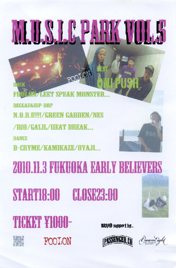 OPEN 17:30 / START 18:00 FEE 1,000yen(+1Drink Order) ■GUEST: 鬼PUSH ■BAND: FOOLON / LEET SPEAK MONSTER / ... ■RAPER & DEEJAY:N.O.B.U!!! / GREEN GARDEN / NES / RIO / GALIL /HEAT BREAK / ... ■DANCE: B-CRYME / KAMIKAZE / OYAJI / ...