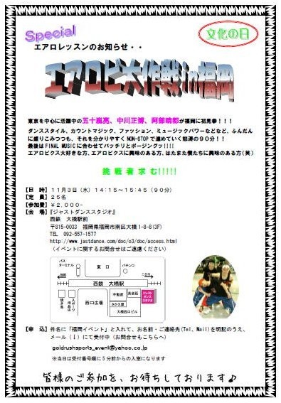 東京を中心に活躍中の五十嵐亮、中川正博、阿部暁都が福岡に初見参!!! ダンススタイル、カウントマジック、ファッション、ミュージックパワーなどなど、ふんだんに盛りこみつつも、それを分かりやすくNON-STOPで進めていく怒涛の90分!! 最後はFINAL MUSICに合わせてバッチリとポージングッ!!!! エアロビクス大好きな方、エアロビクスに興味のある方、はたまた僕たちに興味のある方(笑) 挑 戦 者 求 む 【会 場】『ジャストダンススタジオ』 西鉄 大橋駅前 〒815-0033 福岡県福岡市南区大橋1-8-8(3F) TE