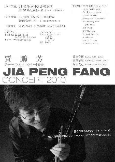 コンサートのご案内をさせていただきます。 いまやすっかり定着した二胡の音色。 第一線で活躍するジャー・パンファン氏のコンサートが 神戸で開催されます。 ■□■ 二胡奏者 賈 鵬芳 JIA PENG FANG コンサート2010 神戸公演 ■□■ 〜誰もが知るスタンダードナンバーが、 美しく透明感溢れるジャー・パンファンの二胡で生まれ変わる〜 今回のコンサートは「デュオ」がテーマ。 サイモン&ガーファンクルやビートルズ、 スティービーワンダーなど往年のヒッ