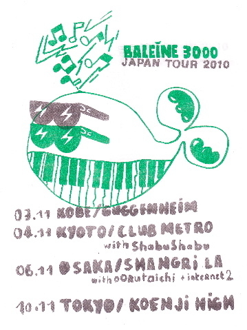 こんにちは。告知させてください。 塩屋音楽会 vol.22 “sonig japan tour 2010″ feat. Baleine 3000「くじらの祝日」 いいことありますか? はい!はるばるヨーロッパからBaleine3000がやって来ます! ドイツはケルンの枠におさまらない気鋭電子音楽レーベル「ソニグ」からくじらが! ベルギーとフランスの素晴らしい音楽家たちにイルリメくんを迎えた、本当に大きな 音楽的快楽。いろんな音楽を詰め込んだ玉手箱的イベントにしてみました。 みなみなさん竜宮城へカモナグッゲンハイム。 (Baleine=バレーヌ【仏語】くじら) * BAL