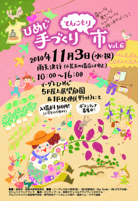 告知失礼します。 11月3日、イーグレひめじ屋上&1F北側にて ひめじ手づくりてんこもり市を開催します。 約100組の手づくり作家さんの作品販売や ステージ(ムチャチャチカベーダ、sana mayu mayu, J plus) ワークショップ(今年は万華鏡や、スイーツデコ、グラスビーズアート) や、毎年人気の占い、似顔絵、 またワンコインのネイル、メイクを楽しめる ビューティコーナーがあります。 また、今年は完全無農薬のお野菜のマーケットゾーンもあり きっと楽しんでいただけるはず!ですので是非おこしくださいね♪ 開催