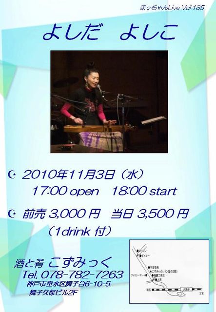 日 時:2010/11/3(水) 17:00 open 18:00 start 料 金:前売 3,000円 当日 3,500円 (1drink 付) 会 場:酒と肴 こずみっく(神戸・舞子) Tel.078-782-7263 神戸市垂水区舞子台6-10-5 舞子久保ビル2F