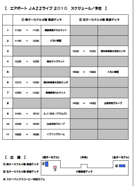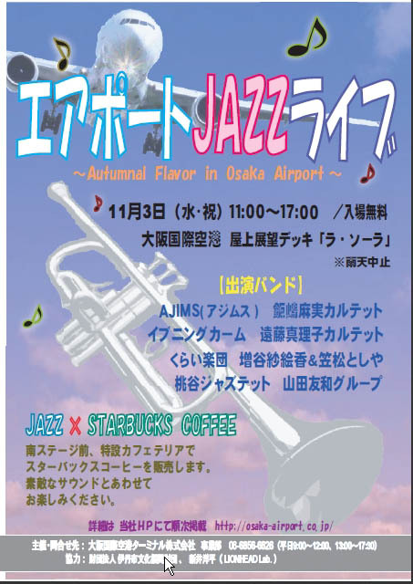 第2回エアポートJAZZライブ 場所:大阪国際空港屋上展望デッキ「ラ・ソーラ」 時間:11:00〜17:00 ※雨天中止 料金:入場無料 act:遠藤真理子カルテット/飯嶋麻美カルテット 他 11:00〜11:30 遠藤真理子カルテット 伊丹エアポートJazz Live http://osaka-airport.co.jp/news/news.html?dn=265 【お問い合せ先】 大阪国際空港ターミナル株式会社 事業部 TEL:06(6856)6626 (平日9:00〜12:00 13:00〜17:30)