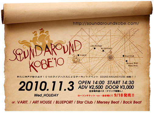 新たに神戸が動き出す! 6つのライブハウスによるサーキットイベント "SOUND AROUND KOBE" 始動!! 1枚のチケットで神戸の6つのライブハウスの行き来自由! 超豪華!総勢約60組のアーティスト出演! 今すぐ公式サイトでチェックせよ!タイムスケジュール公開中!! (http://soundaroundkobe.com/) でも… 出演アーティストが多すぎて誰を見ようか迷っちゃう… そんなアナタにはコチラ!(http://www.starclub.jp/sak_osusume/) Mersey Beat / Back Beat / STAR CLUBが、 満を持して一押しアーティスト教えちゃいます!!!