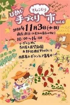 ひめじ手づくりてんこもり市といいます。 手作りを通して、老若男女が交流できる場所を、と いう思いで設立、 今年6年目を迎えました。 11月3日(祝)10時〜16時です。 毎年、ほのぼのと ステージとお城をみながら開催しております。 今年は姫路城が改修になるのでお城はみれませんが それでもきっと、気持ちいい場所のはず! 「趣味でつくっている作品をだしたい」 「自分の作品を是非みてもらいたい」 という方など・・・ 出展に興味をもっていただける方、是非ホームページ (http://himejitezukuri.daa.jp)