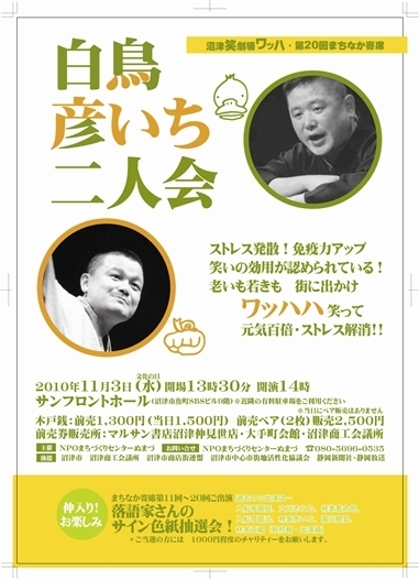 静岡県の沼津市にて、1号&2号二人会です♪ 日時 11月 3日 (水), 14:00 〜 16:00 場所 サンフロントホール(沼津市魚町1、静岡新聞社東部総局ビル9F) 出演 三遊亭白鳥、林家彦いち 前売 1,300円 当日 1,500円 前売ペア(2枚)2,500円 *当日にペア販売はございません。 入場券前売:マルサン書店沼津仲見世店、大手町会館、沼津商工会議所 問い合わせ:NPOぬまづ 080-5696-0535 ※仲入りで、まちなか寄席第11回〜20回出演の落語家さんのサイン色紙の抽選会を行います。 (扇辰・志ら乃・喬太郎・扇治・彦いち・鯉昇・正蔵)