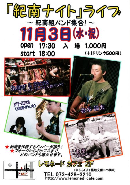 11/3(水)祝 和歌山市ぶらくり丁レモネードカフェ 紀南ナイト〜紀南組バンドを知ろう〜 17:30開場 18:00開演 \1500(1ドリンク付き) 出演 松本陽太 sugar&stone 二重奏 メトロロ