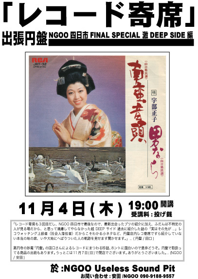 「円盤レコード寄席 NGOO 四日市 FINAL SPECIAL 激DEEP SIDE編」 2010年11月4日(木) 於:閉店3日前の NGOO useless sound pit 午後7時より開講 受講料 投げ銭 「レコード寄席も3回目だし、NGOO四日市で最後なので、最新出会ったブツの紹介に加え、ふだんは不特定の人が見る場だから、と思って遠慮してやらなかった超DEEPサイド 過去に紹介した話の「実はその先が...」レコウォッチング上級者(社会人落伍者)だからこそわかる小ネタなど、円盤店内レコ寄席ですら紹介していない本当の地の底、いや大地にへばりついた人の軌跡を見せます聞