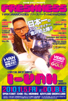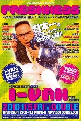 石川のニューダンスビデオカメラスタッフでクレジットされました 金沢にI-VANが来る〜!! 石川県の若手レゲエダンサーズ(gan娘gyalz) 主催のNEW STYLE PARTY -gan娘gyalz presents- 【FRESHNESS】 ■11/5(fri)@DOUBLE ■open 23:00〜till morninng ■adv 1,500yen door 2,000yen 《SPECIAL GUEST DANCER》 I-VAN from jamaica 《SOUND》 JACKNAPES LINA45 3SHINE INTERVAL TANNY DI GANGSTA OCEAN KING ITSUKA 《SOUND SYSTEM》 Blue Mt. 《DANCER》 AATY TATTY CHERIBABY KID 彩