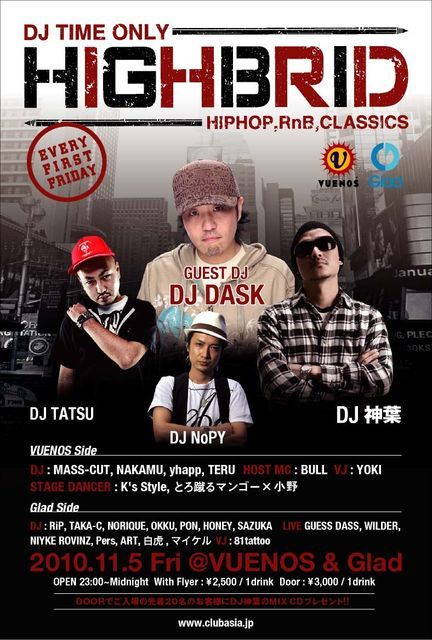 管理人様、告知失礼致します。 毎回どんちゃん騒ぎで大盛り上がり! 驚異的な動員数を誇り、今や渋谷を代表するPARTYのHIGHBRIDがやってきました! 毎月日本TOPクラスのGUEST DJを招き開催されているこのPARTY! 11月はGUEST DJにDJ DASKが参戦! メインストリームを中心に、今や都内で引っ張り凧状態のDJ達が 朝まで楽しませてくれます! Glad の エントランスにて 「 DJ 神葉 の ゲストで ファルコン 」 と言って頂ければゲスト料金1500/1d!でご入場できます! 以下詳細となります。