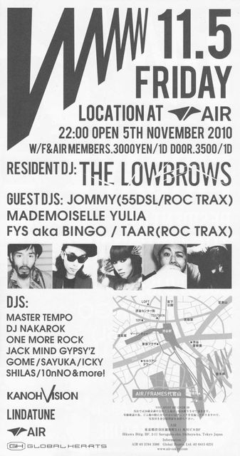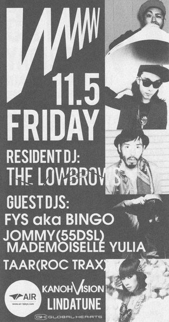 1ドリンク代込の\2500でディスカウント受け付けております お気軽にメッセージください “World Wide Wave”。東京発の気鋭アーティストTHE LOWBROWSが、世界のダンスミュージックシーンとリアルタイムに交信しながら仕掛けるパーティ“WWW”。前回はフレンチレーベルKITSUNE所属CLASSIXXが登場、今回は気鋭ドメスティックDJを多数フィーチュアする。ガラージ からレゲエ、ヒップホップまでジャンルを越えたプレイが人々を狂乱させる東京エレクトロシーンの異端児FYS aka BINGO、パーティ感あるヒップホップ精神と知識に則り、幅