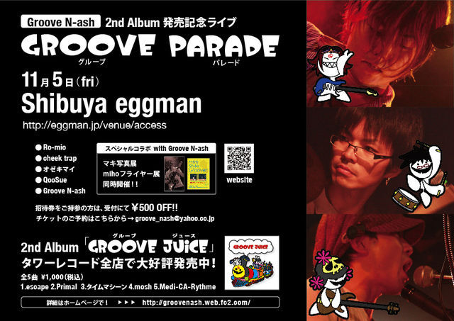 こんばんは(o_ _)o Groove N-ashドラムスほんじぃです。 Groove N-ash(グルーヴナッシュ)コミュニティより、 Groove N-ash 11月LIVE情報をお送りさせていただきます。 ついにやって来ました! Groove N-ash初自主企画イベント、その名も『GROOVE PARADE』!! 現在全国タワーレコードより発売中の Groove N-ash 2nd mini album 「GROOVE JUICE」の発売記念イベントを行います!! Groove N-ashメンバーも初の自主企画LIVEでテンションがおかしくなっております(笑) 今回は特に!皆様、是非お力を貸してください><!! 是非一度見