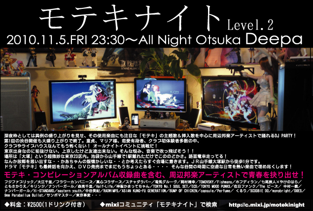 大盛り上がりで終了した第1回開催! お待ちかね第2回のお知らせです☆ クラブやライブハウスなんてもう怖くない! オールナイトイベントに挑戦だ! 「夜中に遊びに行くなんて怖いよ!カツアゲされちゃうよ!」 という気持ちに勇気を! 大丈夫!場所は「大塚」という超微妙な東京23区内。 池袋から山手線で1駅離れただけでこののどかさ。 路面電車走ってる! なんか故郷を思い出すな・・・・かあちゃんの飯懐かしいな・・・・ とか考えたらすぐ会場に着きます。 JR山手線大塚駅から徒歩1分です。 ドラマ「モテキ」も最終