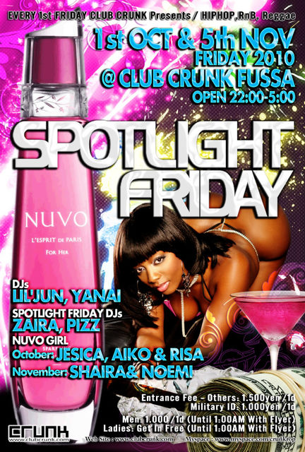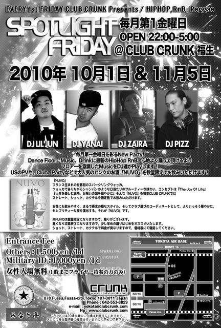 管理人様、告知失礼します。 不適切でしたら削除の方お願いします。 ☆SPOTLIGHT FRIDAY☆ 毎月、福生Club CRUNK 第一金曜日を彩るNew Party Dance Floor、Music、Drinkに最新のHipHop RnB、心地よく踊って頂けるようフロアーを意識したMusicをDJ達がPlayします USのPVや、Club、Partyなどで大人気のピンクのお酒「NUVO」を数量限定でお飲みいただけます ▼フライヤー画像 はこちらから▼ http://photo.mixi.jp/view_photo.pl?photo_id=629247967&owner_id=2700417 ▼日時▼ 11月5日 (金) 22