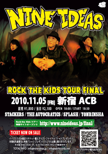 2010年5月12日にリリースして以降、全国50ヵ所以上を回ってきた NINE IDEASが11月5日(金)に新宿ACBにてツアーファイナルを開催!! ゲストバンドも今後日本のメロディックシーンに欠かせない存在になりうる メンツが新宿ACBに集結!! ツアー最後の日でありながら、これからのシーンの始まりの日にもなる、 NINE IDEAS "Rock the Kids" ツアーファイナルを絶対に見逃すな!! 【特設サイト】 チケット情報・特典情報などは特設サイトをチェック! http://www.nineideas.jp/final/ 【チケットe+】 □PC用購入ページリンクURL http://e