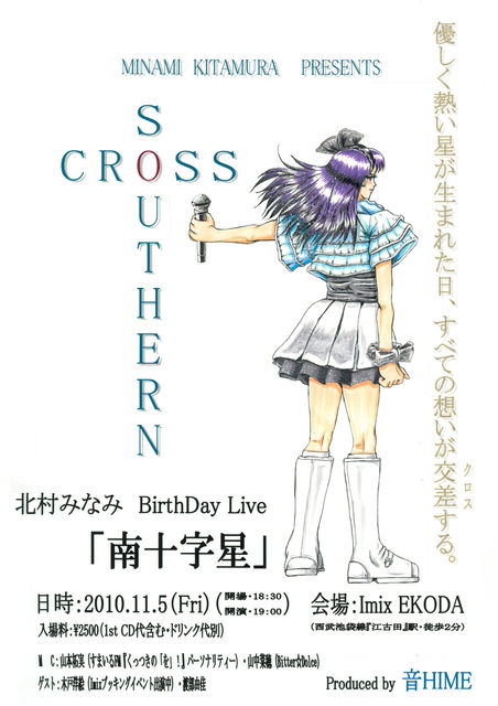 11月5日(金)のみなみちゃんのお誕生日に、 バースデーソロライブが開催されますー。 〜北村みなみ BirthDay Live『南十字星』〜 日時:2010年11月5日(金) 開場18:30/開演19:00〜 料金:¥2,500(Drink別・当日にリリースされるファーストCD代込) 場所:『ライブハウス Imix EKODA』 東京都練馬区小竹町1ー54ー5 江古田STマンションB1 (西武池袋線「江古田」駅 徒歩2分) ※古本屋さんの横の階段を下りたところです。看板がございます。 HP:http://www.imix-ekoda.com/ ご